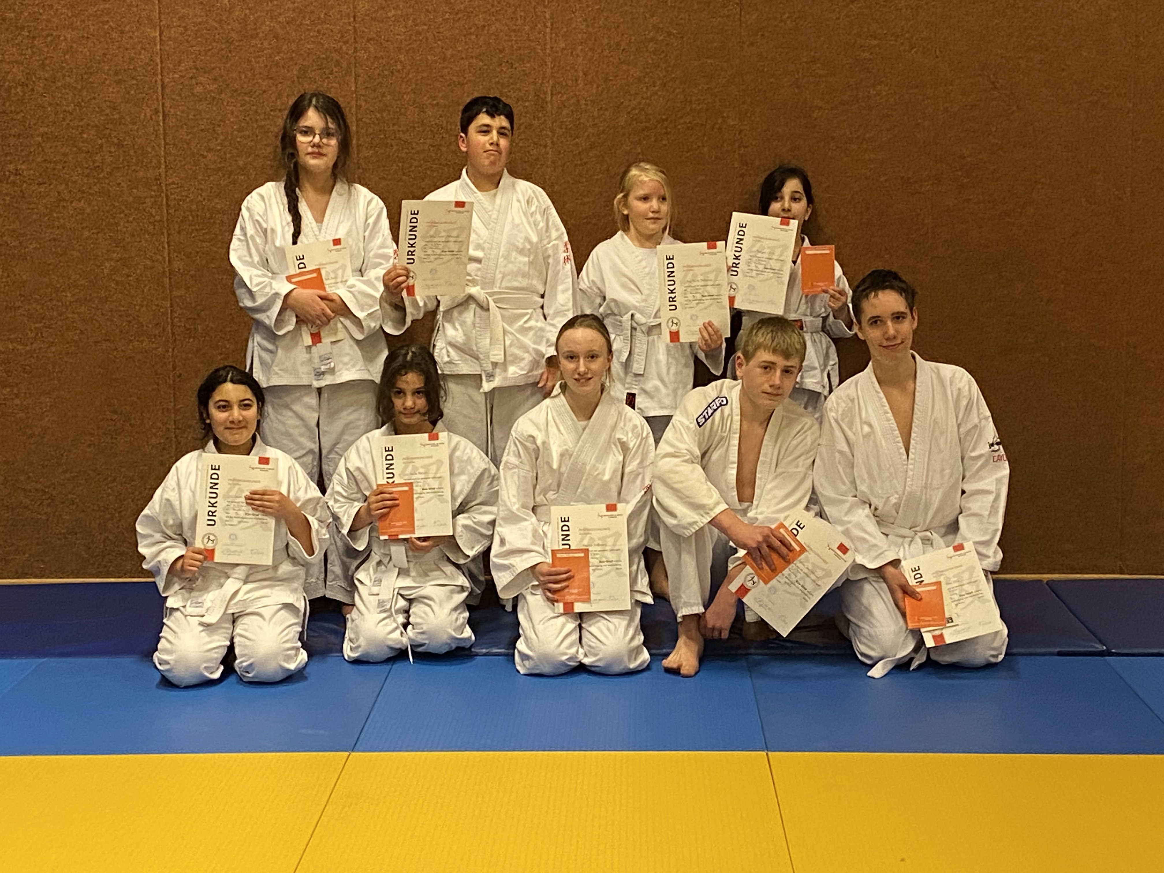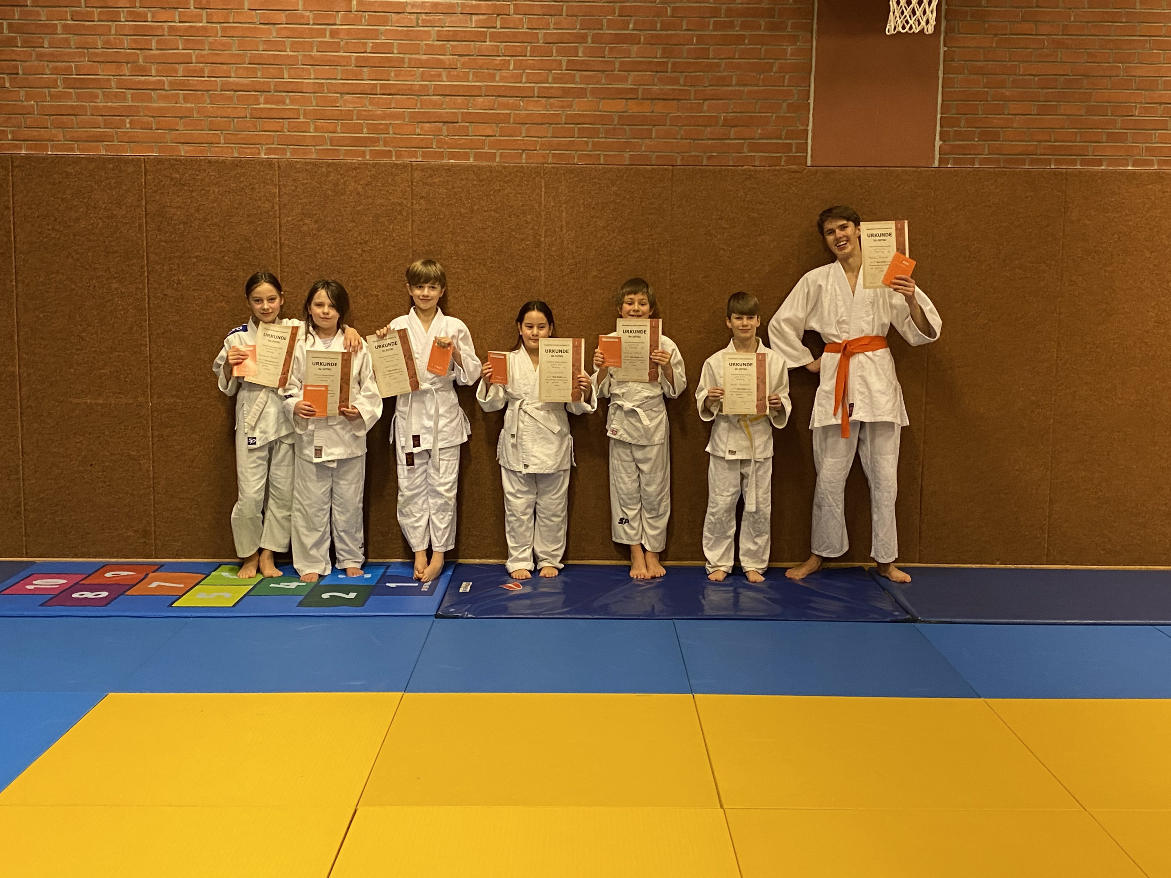 Am 13.12.2023 traten 6 Kinder und ein Jugendlicher zur Gürtelprüfung an. Für die meisten war es die erste Prüfung, daher war die Aufregung groß! Prüfer Claus-Dieter Bergmann-Behm vom TuS Finkenwerder sorgte aber für eine entspannte aber sehr arbeitsame Atmosphäre auf der Matte. Mit großem Ernst und sehr konzentriert wurden die geübten Techniken gezeigt. Am Ende haben alle bestanden und die Gruppe ist mit 6 Gelbgurten und einem Grüngurt deutlich bunter. |