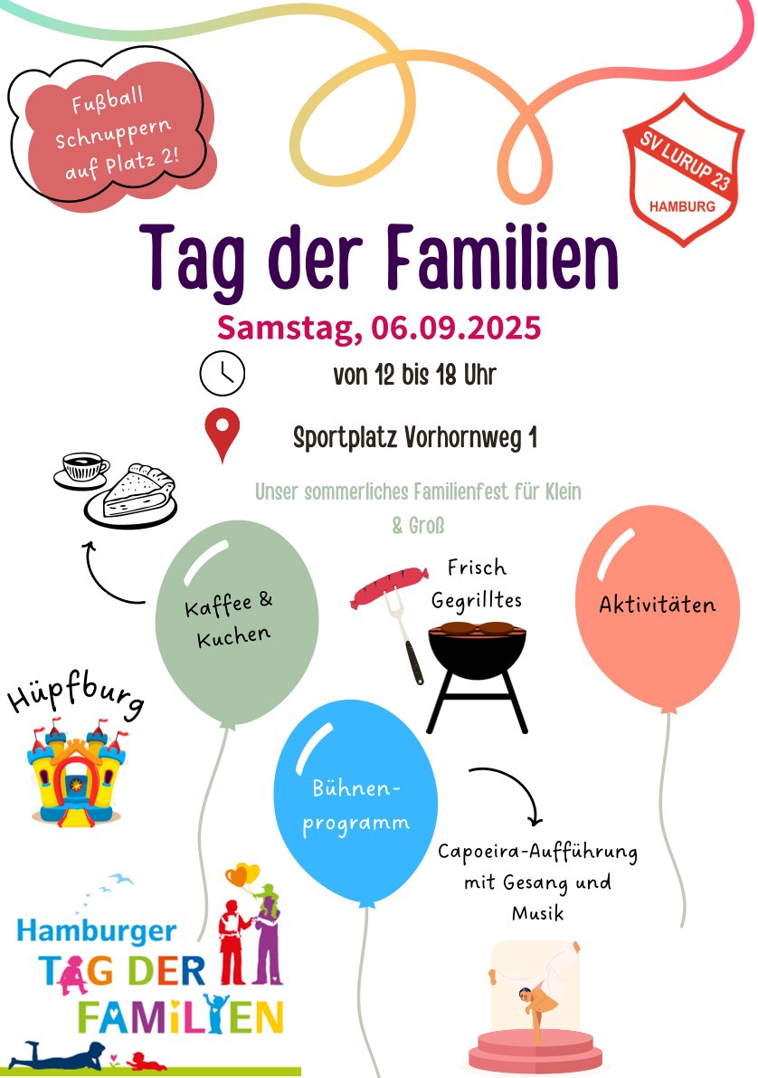 Kommt mit eurer Familie und euren Freunden vorbei und nutzt eines unser zahlreichen Angebote oder kommt einfach auf einen Plausch rum. Es gibt Essen vom Grill und natürlich Kaffee und Kuchen. Dazu haben einige Aktivitäten unter anderem eine Hüpfburg, Fußball-Dart und vieles mehr. Ein Highlight ist der Auftritt von unserer neuen Capoeira Gruppe mit Gesang und Musik. Auf Platz 2 gibt es noch ein Fußball Schnuppern für die Kinder.